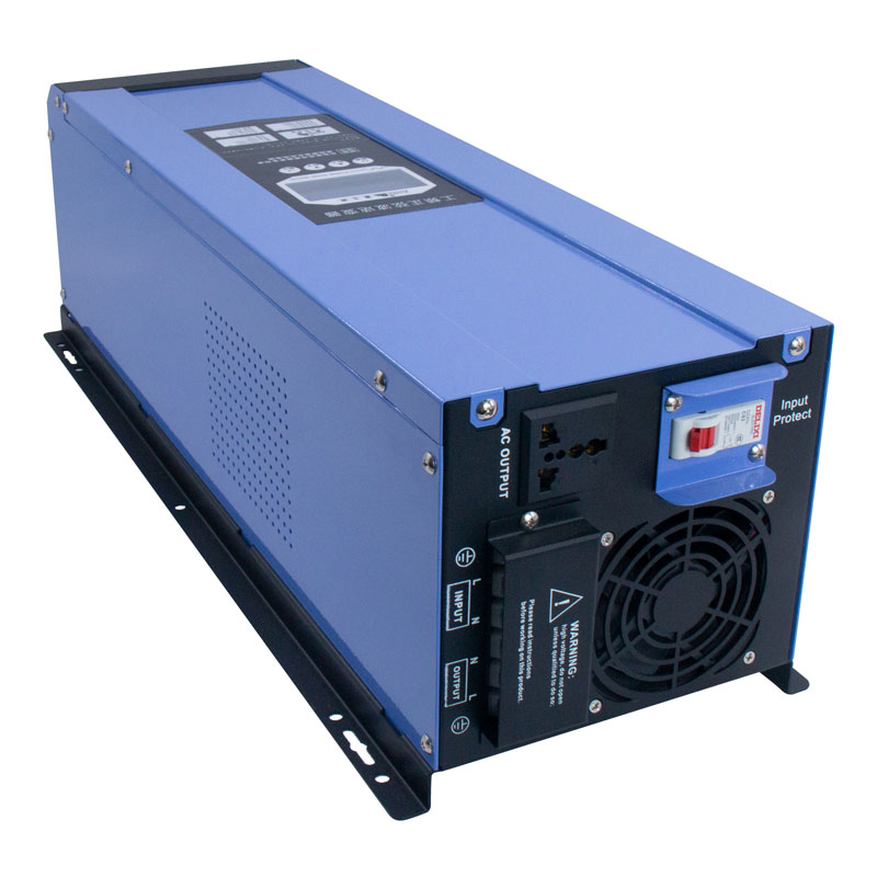 Частотний інвертор синусоїдальної хвилі 24 В 6000 Вт, із різними функціями захисту, такими як коротке замикання, перевантаження, перевищення/зниження напруги, перегрівання тощо. Сильне заряджання від джерела живлення, відображення в реальному часі розміру зарядного струму, швидкість перетворення за мілісекунди, з функцією ДБЖ. Може прийняти: чайник, рисоварка, холодильник, комп’ютер, точні інструменти, резистивне навантаження 5000 Вт, двигун 2200 Вт тощо.